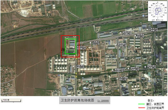 環(huán)境影響變更補(bǔ)充報(bào)告中對各裝置衛(wèi)生防護(hù)距離做出了估算,本項(xiàng)目裝置區(qū)和罐區(qū)的衛(wèi)生防護(hù)距離,為50m,根據(jù)現(xiàn)場踏勘,本項(xiàng)目衛(wèi)生防護(hù)距離內(nèi)無村莊分布,滿足項(xiàng)目衛(wèi)生防護(hù)距離的要求,衛(wèi)生防護(hù)距離內(nèi)無新建居民點(diǎn)等環(huán)境敏感目標(biāo)。衛(wèi)生距離包絡(luò)圖見圖2-1。